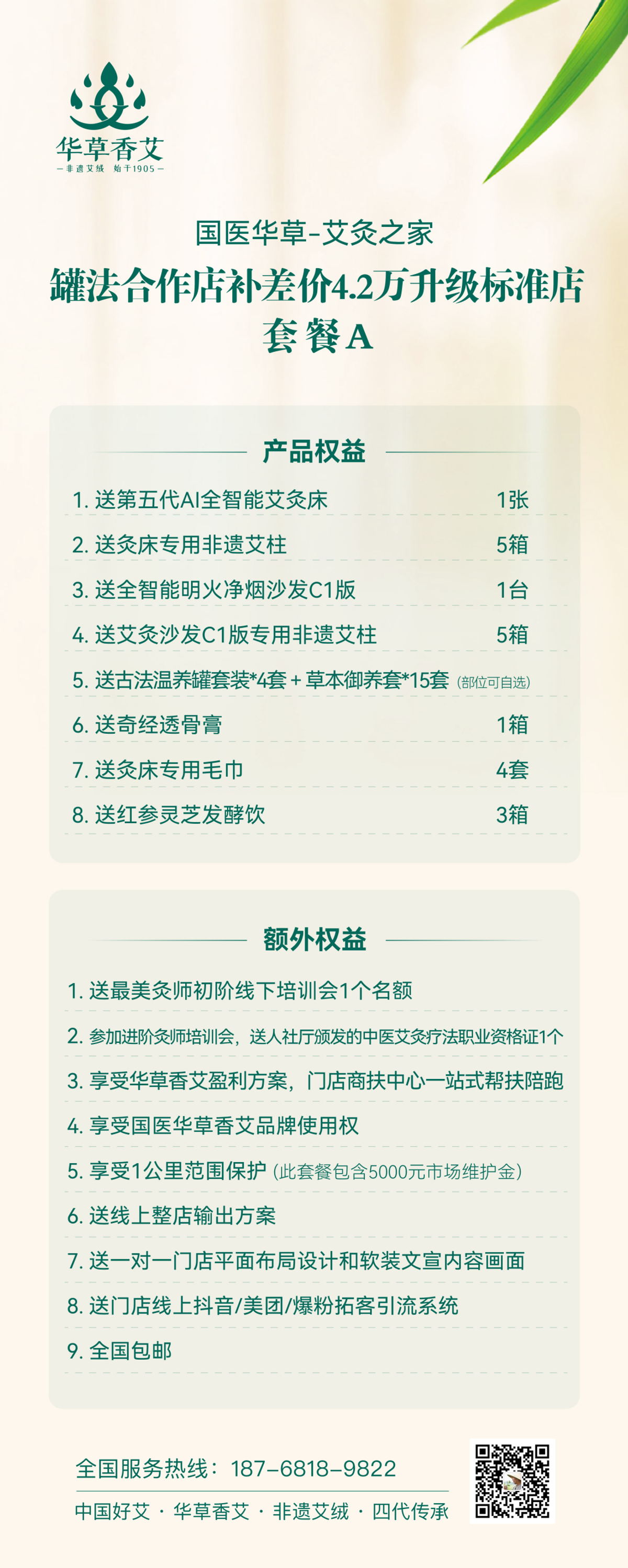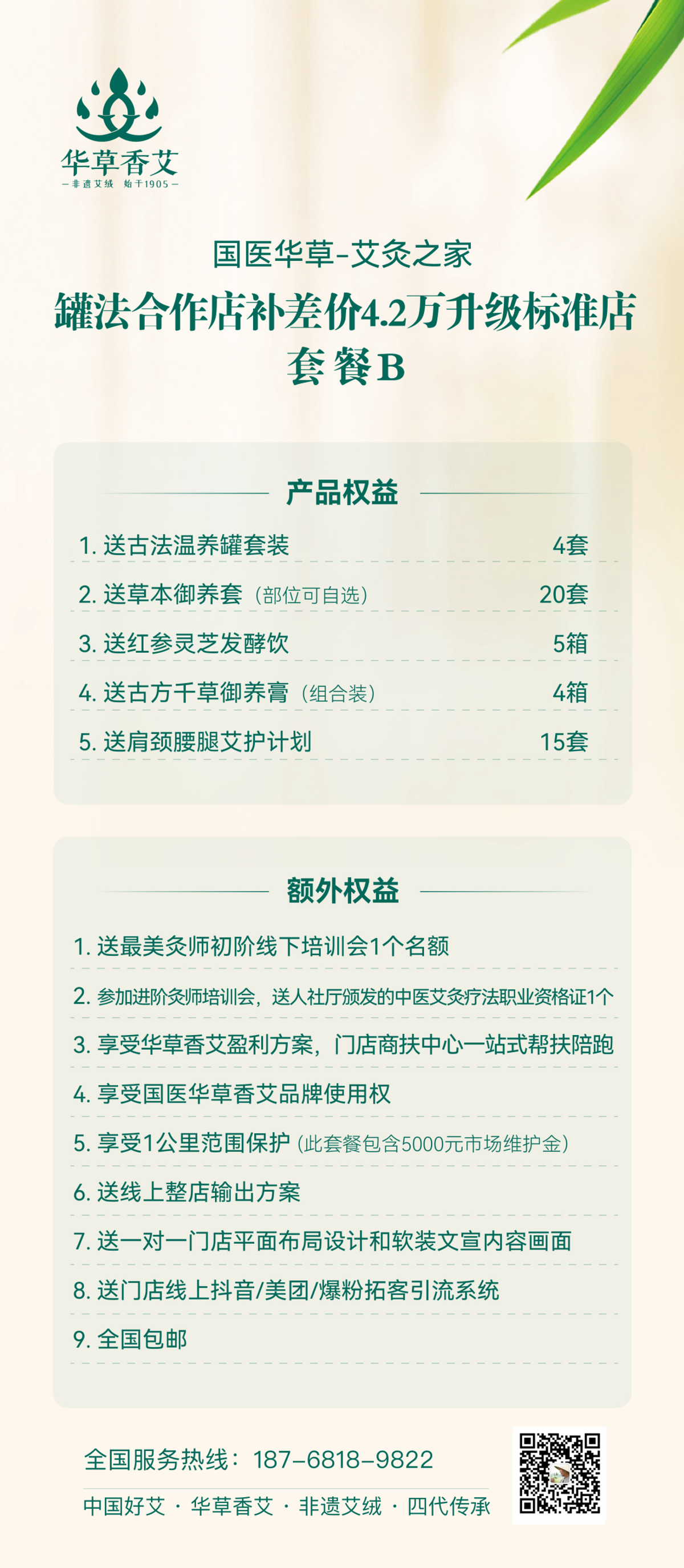 如果说你想把艾灸当成事业去做,合作8900方案以后,觉得咱们品牌靠谱,说的就是做的,还可以升级成我们的标准店,授权你使用国医仲景的门头,正式成为我们品牌的门店,享受全国连锁门店带来的附加效益。