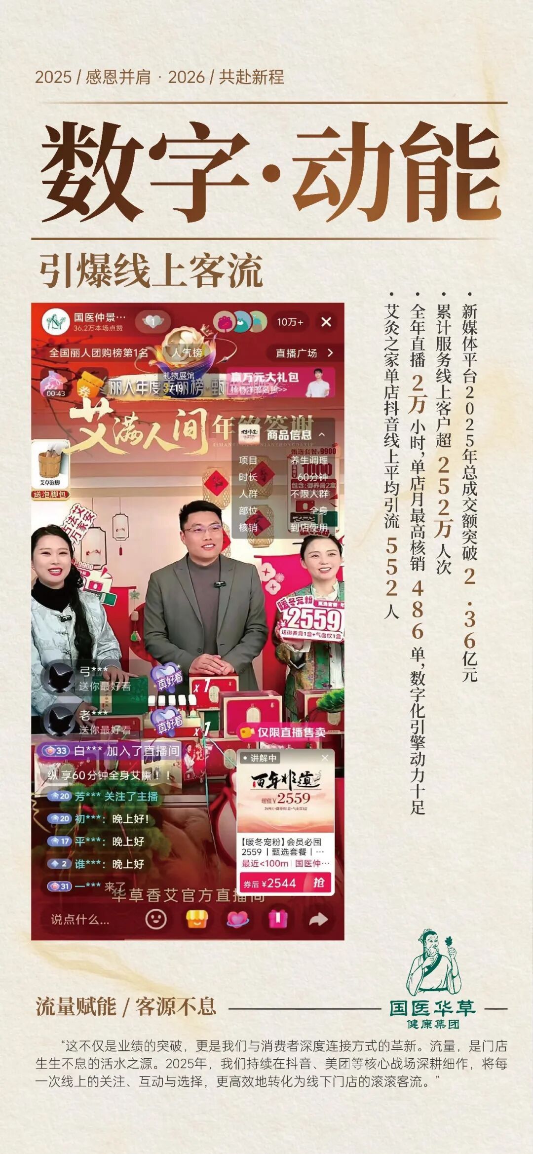 根据国医华草新媒体部门2025年数据显示,2025年平均帮助每家门店线上拓客并核销552人次,解决门店客流问题。